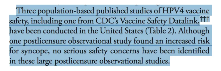 «Tres estudios poblacionales sobre la seguridad de vacuna HPV4, incluyendo uno de la base de datos de Seguridad de Vacunas Datalink del CDC, han sido desarrollados en Estados Unidos. Aunque un estudio observacional post licencia encontró un riesgo de desmayos aumentado, no se identificaron preocupaciones de seguridad en estos estudios».