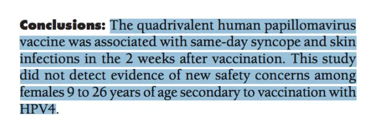 «La vacuna cuadrivalente VPH se asoció con cuadros de desmayos el mismo día e infecciones a las dos semanas de vacunación. El estudio no detectó evidencias de nuevas preocupaciones de seguridad en mujeres de 9 a 26 años secundario a vacunación con VPH4».«Este gran estudio de cohortes no encontró evidencia que apoye la asociación entre exposición a vacuna qHPV y eventos adversos autoinmunes, neurológicos o tromboembolismo venoso. Aunque inicialmente se observaron tres eventos autoinmunes, en evaluaciones posteriores se confirmó que eran débiles y no estaban relacionados temporalmente con la exposición a la vacuna».