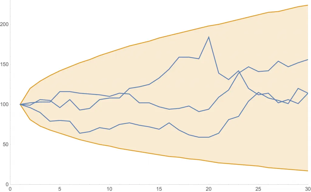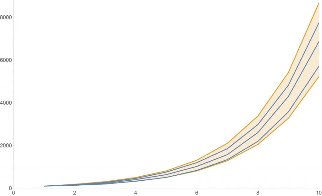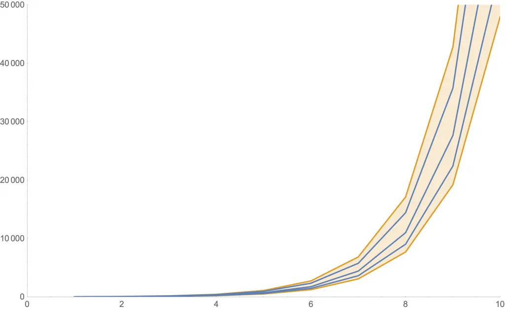 Ejemplos de la cantidad de nuevos casos con este modelo con dados. Como las curvas son aleatorias, mostramos tres de ellas en azul. Además, la zona anaranjada muestra dónde estará una curva con al menos 80% de probabilidad.