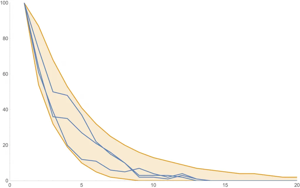 Las siguientes figuras muestran algunas simulaciones estos procesos que dependen de la edad. En cada una, se ven tres posibles curvas de nuevos contagios (azul) y la zona de 80% probabilidad (anaranjado). Además, en ambos casos la generación cero comienza con , pero se diferencian en la velocidad con la que decrece este parámetro.