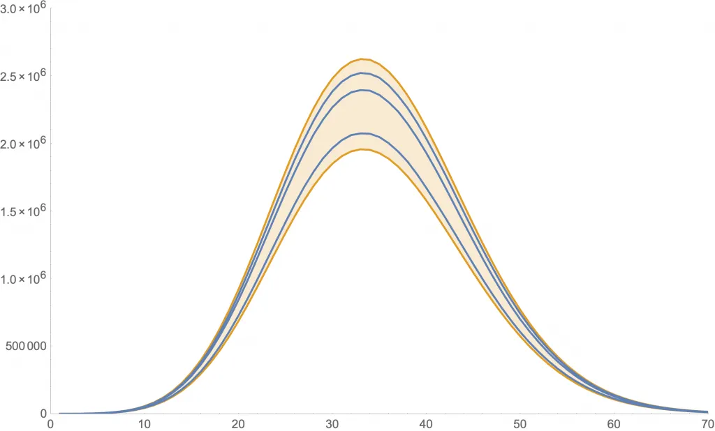 Las siguientes figuras muestran algunas simulaciones usando una distribución más realista (llamada «de Poisson») con distintos valores de . En cada una, se ven tres posibles curvas de nuevos contagios (azul) y la zona de 80% probabilidad (anaranjado).
