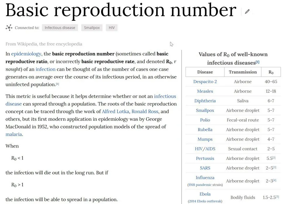 Una definición más precisa sería la siguiente: el es el número promedio de personas que una sola persona infectada va a contagiar, bajo la suposición de que todas las personas son igualmente contagiables y que no se están aplicando medidas de mitigación. Enfermedades poco contagiosas como el MERS tienen un entre 0,3 y 0,8, mientras que enfermedades muy contagiosas como el sarampión tienen un entre 12 y 18. En el caso del COVID-19, todos los resultados son muy recientes, pero por ahora se estima que su está entre 2 y 2,5 [9].