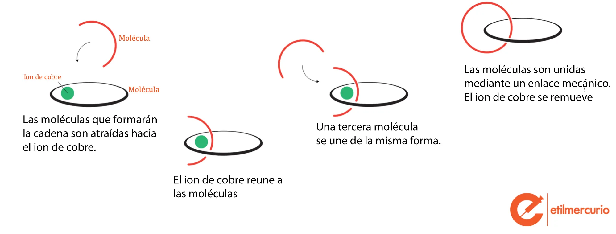 Utilizando un ion de cobre como «pegamento», lograron unir tres moléculas en forma de anillo. Al retirar el ion de cobre, las moléculas siguen unidas, pero con libertad de movimiento.