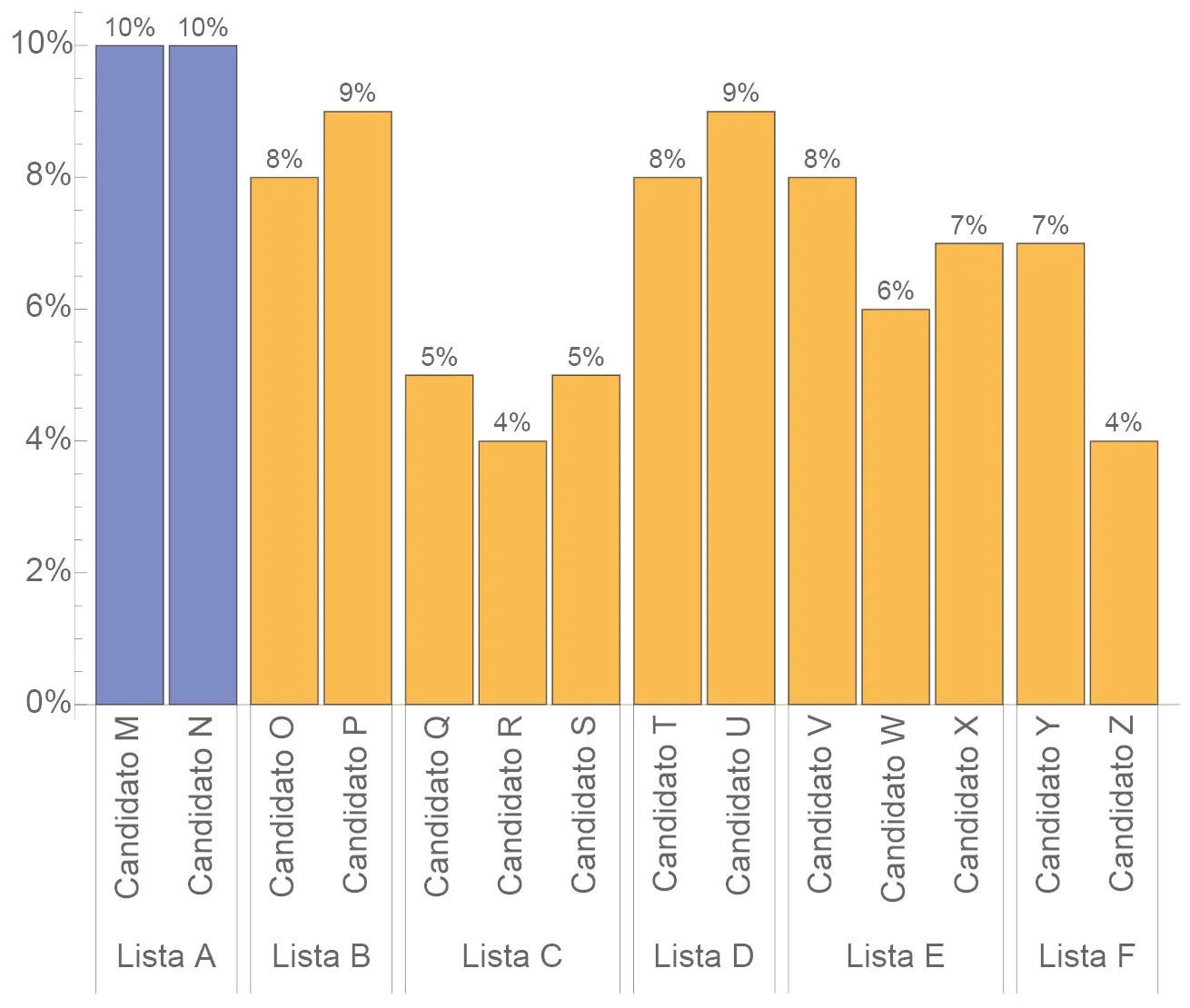 En este ejemplo, elegir «los más votados» genera dos distorsiones. 1) Los candidatos M y N serían electos, a pesar que la lista E obtiene más porcentaje de votos que la Lista A. 2) Lista A obtiene el 100% de los candidatos con sólo el 20% de los votos. Si esta situación se replica en todos los distritos, los escaños totales en el parlamento no estarán bien distribuídos de acuerdo a los votos.