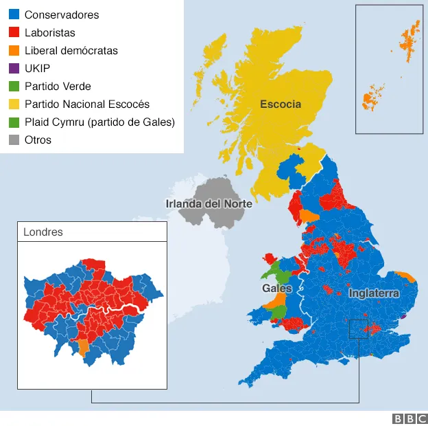 Resultados de una elección general (parlamentaria) en Reino Unido. Note la ausencia de duopolio.