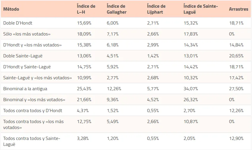 Dentro de los métodos que usan el distritaje actual, el método usando D’Hondt dos veces (lo que se usa actualmente) es uno de los más proporcionales, sólo mejorado por el que usa el método de Sainte-Laguë dos veces. En general, usar «los más votados» aumenta la desproporcionalidad, pero, en contraste, el método de usar D’Hondt entre pactos y luego los más votados dentro de cada pacto es comparable al método actual. El método binominal es, por lejos, el más desproporcional usando los datos actuales.