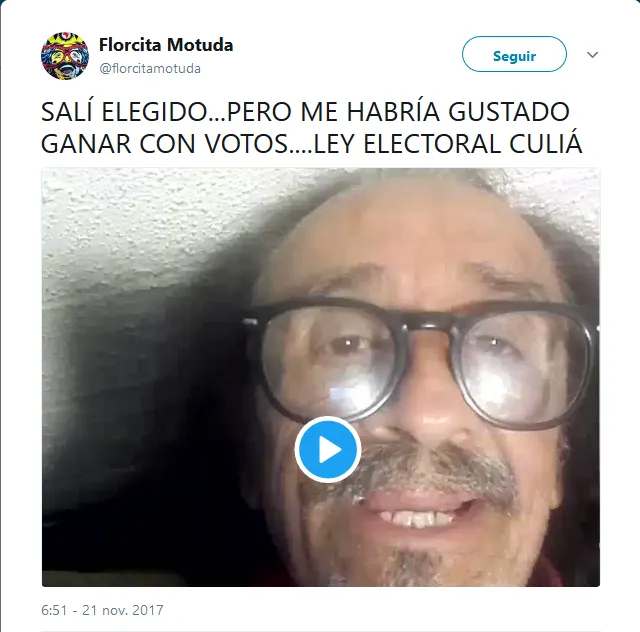 Florcita «Motuda» Alarcón resultó electo diputado en el Distrito 17 tras obtener el 2,38% de los votos en total, siendo superado por candidatos de otras listas que no fueron electos. Esto lo llevó a decir que el sistema «no era democrático». Y que más democrático que elegir una Florcita (?).
