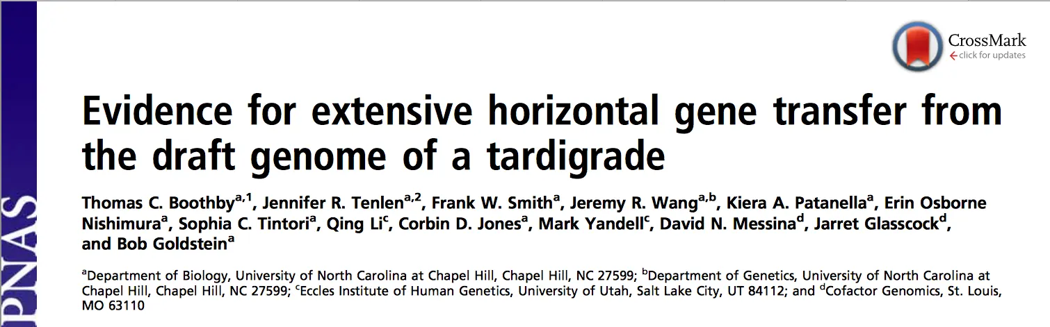 Boothby et al. Evidence for extensive horizontal gene transfer from the draft genome of a tardigrade. Proceedings of the National Academy of Sciences, vol. 112, n° 52 (2015). doi: 10.1073/pnas.1510461112