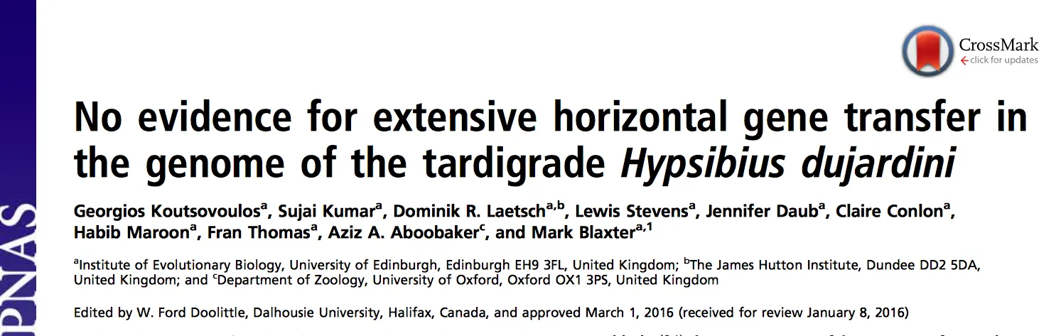 Koutsovoulos et al. No evidence for extensive horizontal gene transfer in the genome of the tardigrade Hypsibius dujardini. Proceedings of the National Academy of Sciences, vol. 113, n° 18 (2015). doi: 10.1073/pnas.1600338113