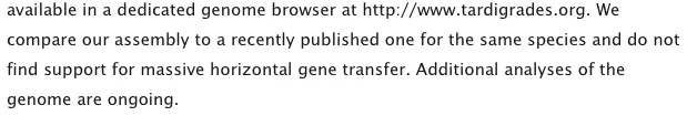 Cuando trabajas con organismos tan interesantes como los tardígrados, debes saber que siempre habrá alguien detrás tuyo investigando lo mismo. Y eso es justamente lo que sucedió. Unos meses después (probablemente no alcanzó a pasar un mes) una nueva investigación salió publicada en la misma revista (3). El resultado principal es que ellos no encontraron esta evidencia de «genomas ajenos», al menos en la especie de tardígrado llamada Hypsibius dujardini, que fue la que ambos grupos estudiaron. De hecho, se puede leer en el resumen de [trabajo lo siguiente:](http://(http://biorxiv.org/content/early/2015/12/01/033464)