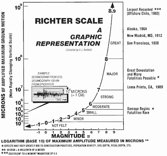 La escala Richter fue creada por los sismólogos Richter y Gutenberg en 1935: expresa cuantitativamente la magnitud de un sismo, para lo cual se vale de un cálculo logarítmico que nos da una idea de la magnitud que tiene la energía que se libera en un temblor o terremoto. Al ser una escala logarítmica, la energía liberada se multiplica a medida que la escala aumenta, en lugar de tener un crecimiento constante.