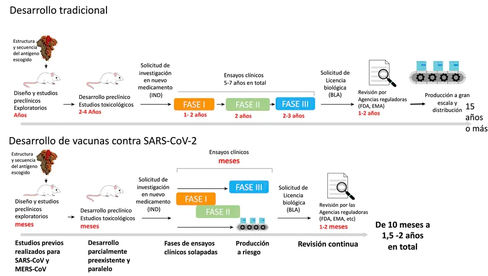 Primero, las tecnologías para la fabricación de estas nuevas vacunas ya estaban estudiadas desde hace muchos años. Incluso con la innovadora vacuna de ARNm, la técnica se estaba desarrollando desde hace más de 20 años. También jugó a favor toda la investigación científica generada durante las epidemias de SARS y MERS en años previos, a la que tenían acceso los grupos de trabajo. Así que la investigación para la vacuna contra el Sars-CoV-2 no empezaba de cero, sino que se sostenía sobre una buena base de conocimientos.
