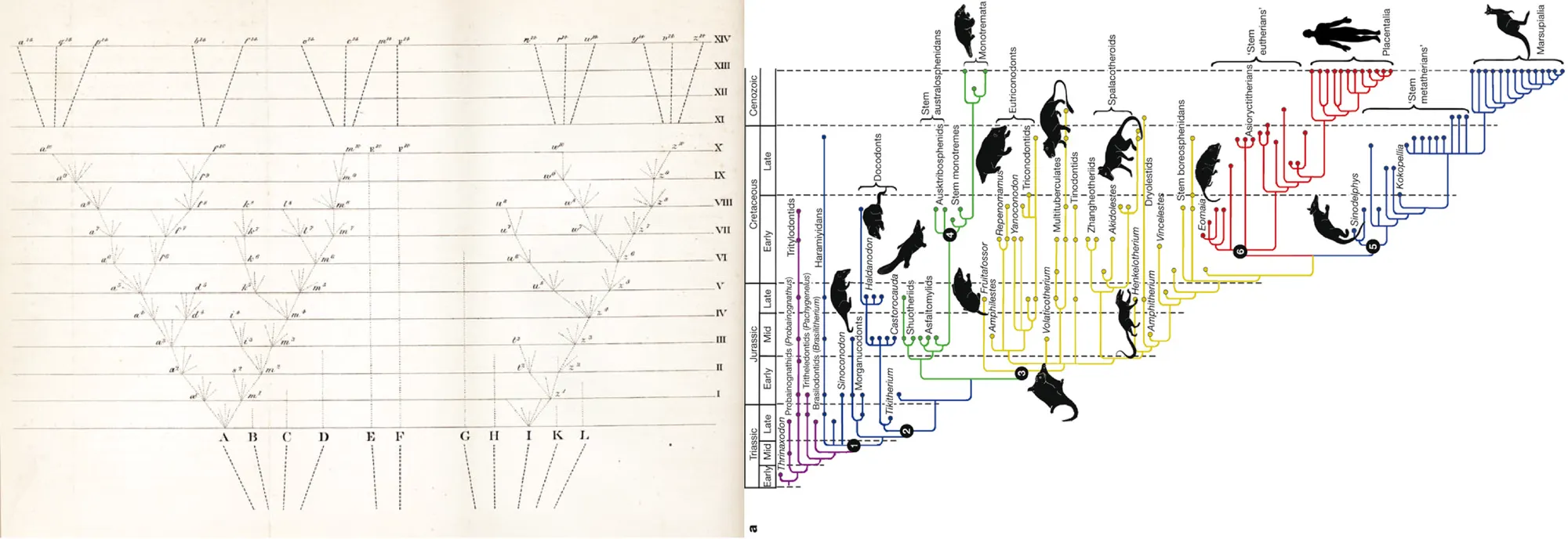 A la izquierda, la hipótesis de Darwin. A la derecha, una filogenía de los mamíferos publicada el 2007 (Zhe-Xi Luo Nature 450, 1011-1019)