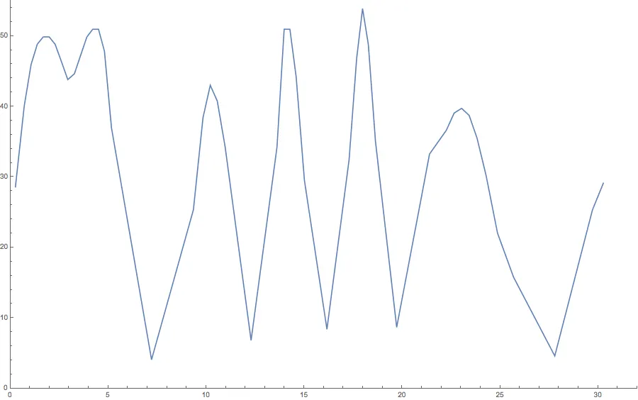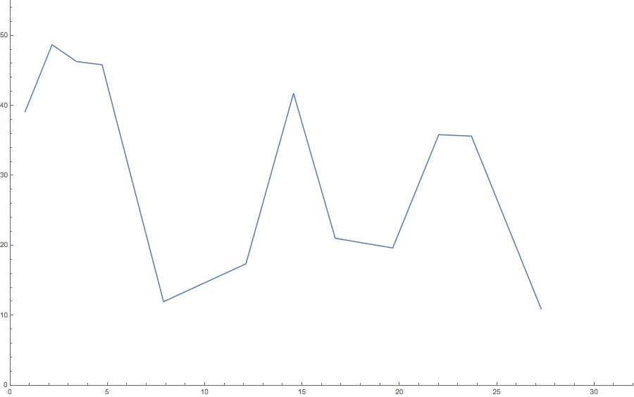 Recordando que la rapidez es la tasa de cambio de la distancia recorrida, decide registrar el tiempo que tarde en bus en recorrer cada kilómetro, es decir, cada tramo de 8 cuadras como primera estimación. Luego calcula el cociente entre la distancia recorrida (un kilómetro) y el tiempo que tardó el bus en recorrerla (que usted midió con el reloj). Graficando el resultado, obtiene algo como esto: