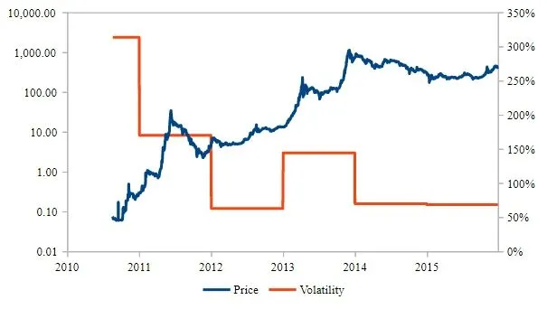 Este gráfico muestra cómo ha variado el valor de las bitcoins en los últimos años. Como puede verse, la moneda electrónica ha tenido variaciones importantes de precio en un tiempo relativamente corto. Coindesk tiene un gráfico interactivo.