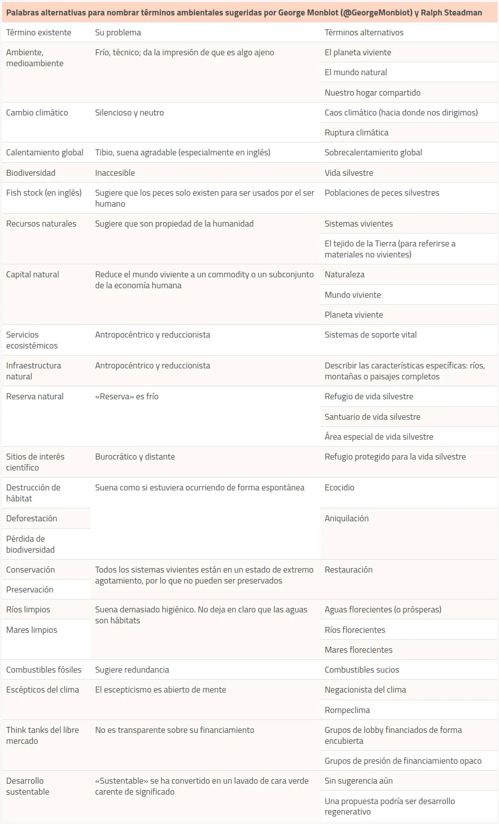 Propuesta de cambios en conceptos relacionados con el calentamiento global para dar cuenta de lo urgente que es reaccionar. El lenguaje crea realidad. Fuente: @GeorgeMonbiot