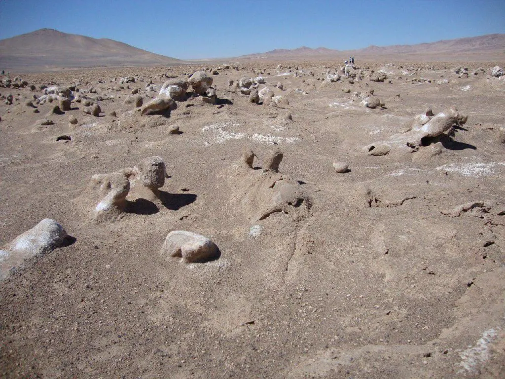 Además de seco, el sector es salino. Tan salino que las «halitas» (NaCl puro) forman verdaderas flores de piedra que cubren los campos desérticos.