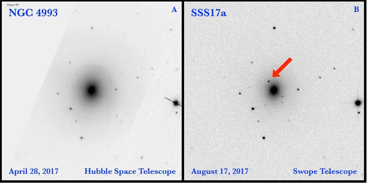 A la izquierda, una imagen del Hubble Space Telescope de la NASA de la galaxia NGC 4993 captada en abril y a la derecha, la imagen captada por el telescopio Swope el día 17 de agosto. La flecha indica la colisión de las estrellas de neutrones.