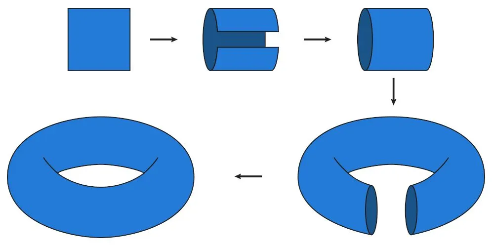 Pasos intermedios al pegar los lados opuestos de un cuadrado hasta obtener una dona.