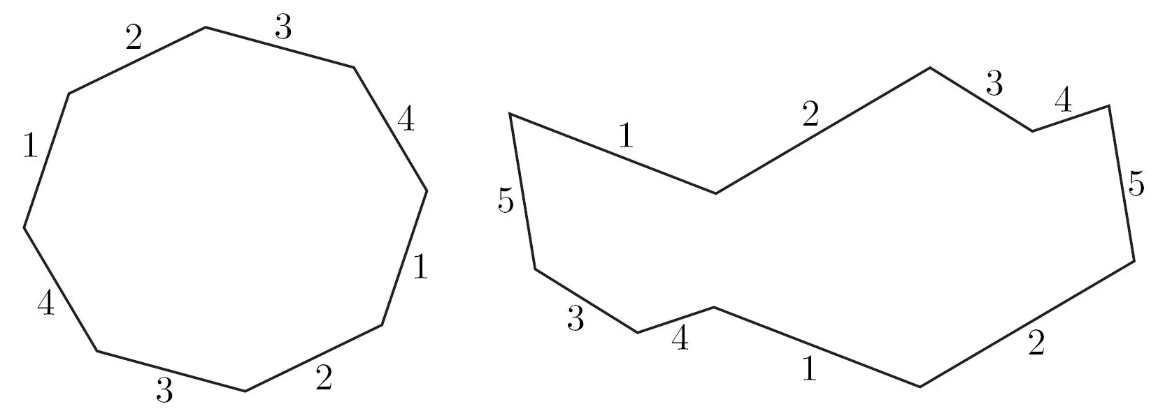 Ejemplos de superficies de traslación. Los números indican la forma emparejar los lados.