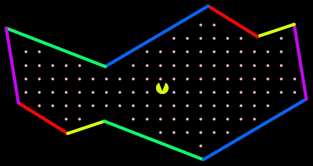 Juego de Pacman en una superficie plana. Al salir del polígono se «transporta», mediante una traslación, al lugar correspondiente del lado emparejado.