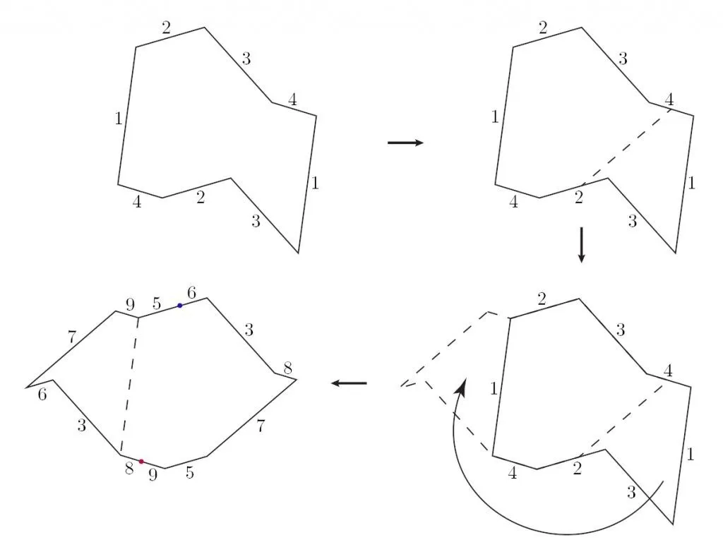 Comenzando con el polígono de arriba a la izquierda, elegimos una línea por donde cortar. Luego, pegamos los dos polígonos resultantes juntando sus lados 1, obteniendo finalmente el polígono de abajo a la izquierda. El polígono original y final representan exactamente la misma superficie de traslación. Note que se crearon nuevos lados etiquetados por 5, 6, 7, 8 y 9. Los dos primeros provienen de cortar el lado 2, el lado 7 proviene de la línea por donde elegimos cortar y los últimos dos de cortar el lado 4.