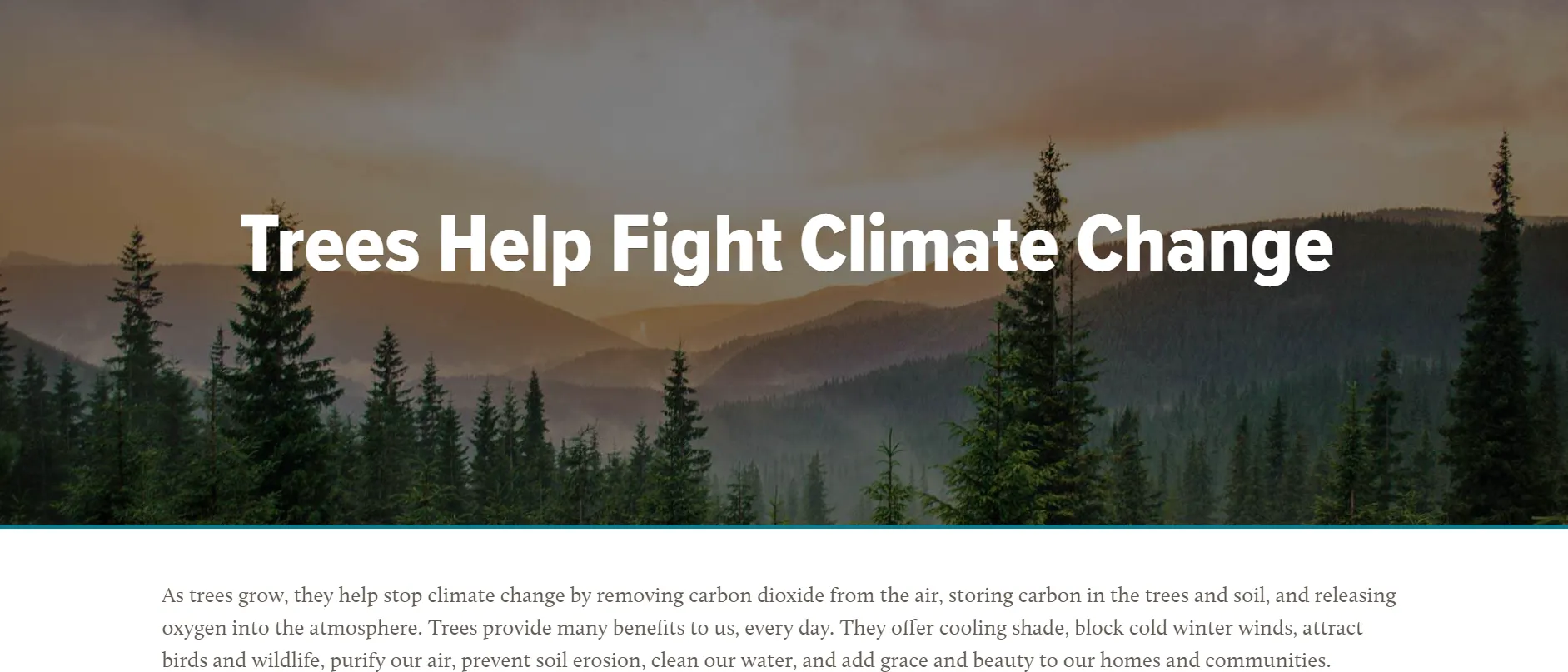 "Los árboles ayudan a combatir el cambio climático". Captura: https://www.arborday.org/trees/climatechange/