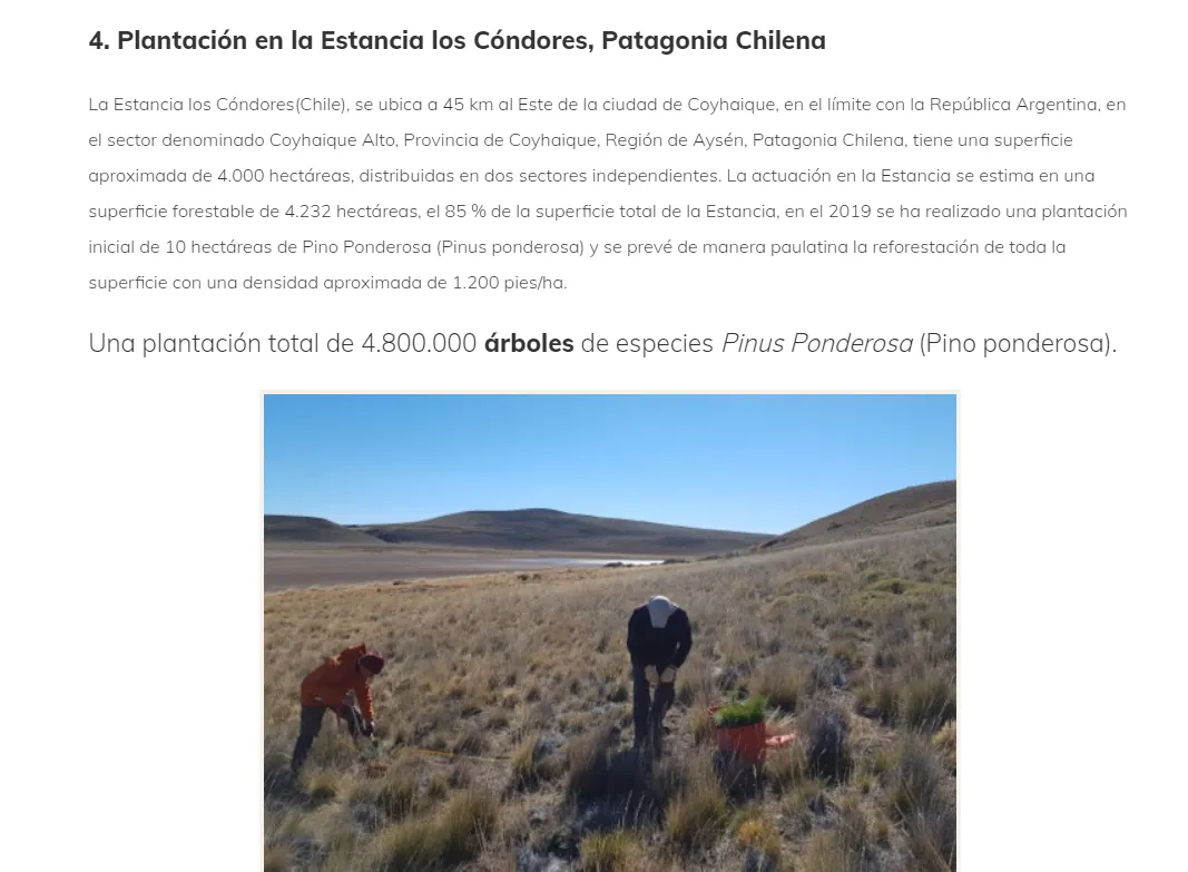 Hace unos días, poco antes de terminar julio de 2021, bajo el argumento de la mitigación del cambio climático, el dueño de las viñas Miguel Torres contó que están «reforestando» con una especie de pino (Pinus ponderosa) un terreno que compraron barato en la Patagonia chilena (ver acá, en el minuto 3:06). El terreno se encuentra específicamente en la Estancia Los Cóndores, en Coyhaique Alto, a unos 40 kilómetros al oriente de la ciudad de Coyhaique.