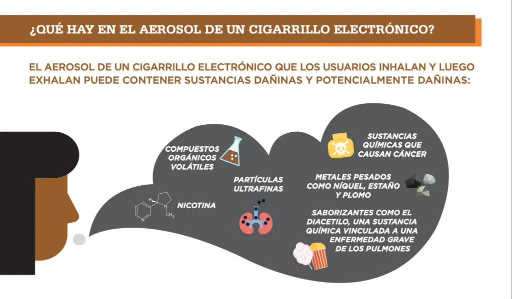 En general, se trata de dispositivos que calientan un líquido y liberan un vapor que es aspirado por su usuario. Es decir, en lugar de quemar hojas de tabaco (y aditivos), generan aerosoles para inhalar el vapor. Los cartuchos con líquido pueden contener altas cantidades de nicotina, compuestos tóxicos y aditivos saborizantes, generando fuerte adicción en el público juvenil (4–7).