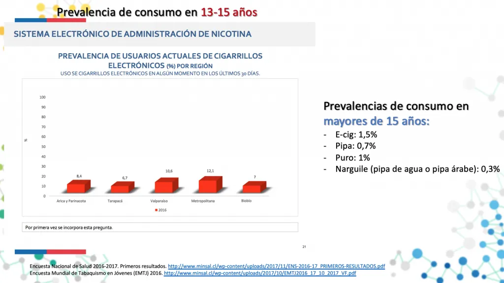 En Chile, la regulación de estos productos debe actualizarse. El año 2010, el Instituto de Salud Pública (ISP) les entregó resolución de «producto farmacéutico» (14), confiando en las investigaciones sesgadas de la industria, que los promocionaban como útiles para dejar de fumar.
