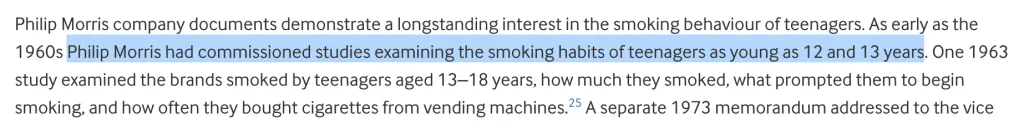 De hecho, una rápida mirada rápida a los documentos internos de la industria reveló que las tabacaleras han investigado el comportamiento de niños y niñas desde los 12 años para ajustar mensajes y campañas publicitarias para captar su atención (12).