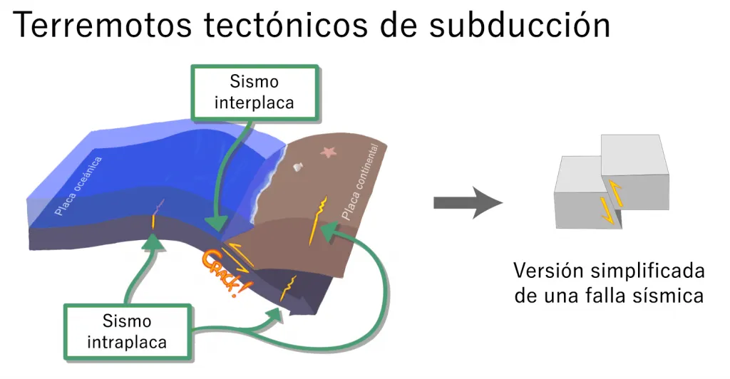 Los terremotos más grandes son los generados por el deslizamiento de una placa tectónica bajo otra (los sismos de subducción interplaca: vea la primera figura), así que utilizaremos estos para nuestro análisis.