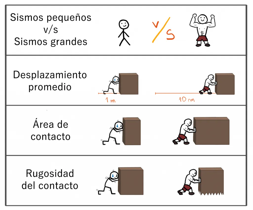 Entonces, viéndolo de forma simplificada, un terremoto tectónico mueve un bloque con respecto a otro a través de una fractura. Por lo tanto, un sismo va a ser más poderoso cuando es capaz de desplazar aquel bloque más lejos, cuando el área de contacto entre los bloques es mayor (lo que equivale a un bloque más grande) o cuando la rugosidad entre los bloques es alta.