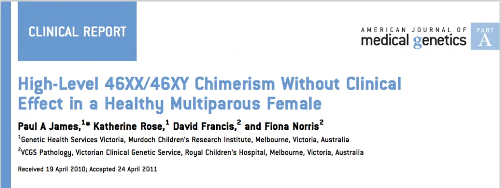 Paul James, un genetista clínico, visitó en el 2009 a una mujer embarazada de 46 años en su clínica, en el Royal Melbourne Hospital en Australia, luego de escuchar sobre los resultados de un examen llamado amniocentesis. Este examen consiste básicamente en una punción para extraer líquido amniótico, evaluar los cromosomas del bebé y buscar eventuales problemas. Todo estaba bien con el bebé, pero luego de varios exámenes descubrió algo sorprendente sobre su madre: su cuerpo estaba constituido por células de dos individuos. Probablemente se trataba de dos embriones mellizos que se fusionaron en el vientre de su madre (si vieron Dr. House, recordarán que hay un capítulo muy bueno sobre eso, donde un niño alucina con que es abducido por extraterrestres y finalmente se descubre que... OK, sin spoilers).