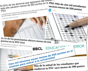 Otro ejemplo ocurre con frecuencia en la prensa chilena a la hora de analizar los resultados de la PSU. A fines de cada año, no es extraño ver un titular alarmista del tipo «la mitad de los estudiantes sacó menos de 500 puntos». La verdad es que el sistema de puntajes de la PSU está diseñado para que el promedio de los puntajes se sitúe siempre alrededor de 500 puntos y que la distribución de puntajes sea «simétrica» en torno a ese valor (en ñoño más precisamente, se aproximan los datos a una distribución normal con media 500). No es tan extraño, entonces, que la mitad de los puntajes esté bajo el promedio. O sea, de noticioso, no hay mucho.