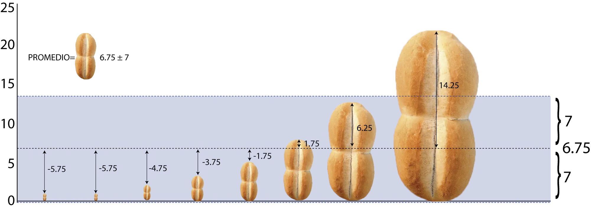 La idea detrás de las medidas de dispersión es bastante intuitiva y podríamos entenderla simplemente como «qué tanto se dispersan o separan mis valores respecto a una medida de tendencia central» (por ejemplo, la media). Con panes se vería algo así. La línea punteada del centro es el promedio, y toda el área azul es la desviación estándar, es decir, cuanto se dispersan los panes respecto al delicioso pan promedio. En el primer ejemplo, el pan más grande es una marraqueta como todas, pero poderosa. En el segundo ejemplo todos los panes son similares, por lo tanto, la desviación estándar es mucho más pequeña. Eso significa que efectivamente a todos nos llega algo.