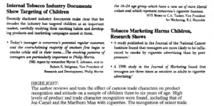 Un predictor de adicción en niños era conocer a Joe Camel (un camello antropomórfico destinado a atraer la atención de niños de 14 a 18 años). Ahora sabemos que las tabacaleras desarrollaron y usaron a este personaje para captar y retener al público infantil (5,6). El personaje causó tanta controversia en Estado Unidos que dejó de utilizarse en 1997.