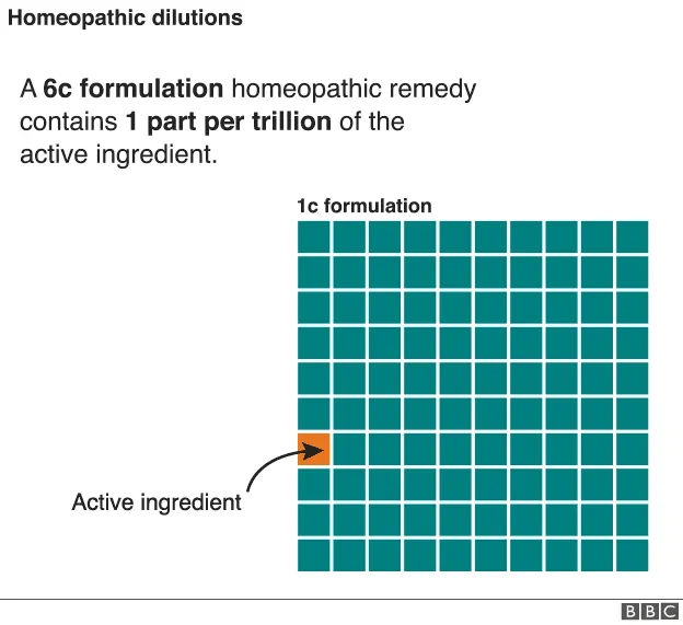 Acá un ejemplo de como sería una dilución de 6C (imagine usted una 30C). Fuente: BBC