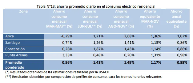 Para realizar una estimación de los efectos a nivel nacional, se establecieron macrozonas que representan a las diferentes regiones. Así, se observa que el ahorro anual alcanza un 0,88%, lo que es equivalente a 103 GWh anuales, aproximadamente el consumo eléctrico de 43.000 viviendas en un año. El ahorro anual para el país es de 11.600 millones de pesos (16,5 millones de dólares) y $2.370 anuales para los clientes residenciales.