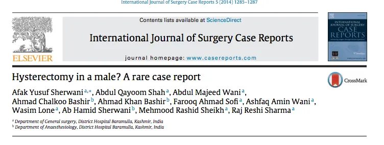 Sherwani AY, Shah AQ, Wani AM, Bashir AC, Bashir AK, Sofi FA, et al. Hysterectomy in a male? A rare case report. International Journal of Surgery Case Reports. 2014;5(12):1285–7.