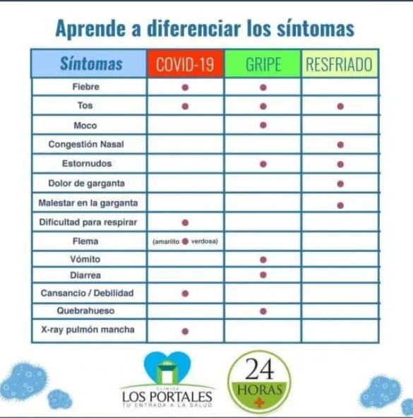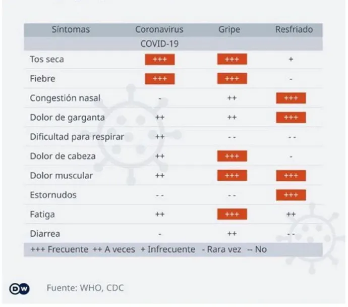 Me llegó esta tabla con los síntomas de COVID-19, así lo distingo de un resfrío o gripe común ¿es correcta?