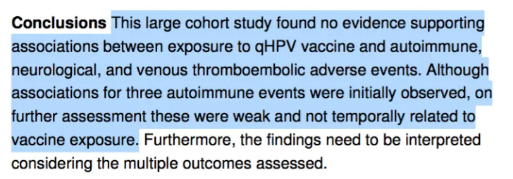 «La vacuna cuadrivalente VPH se asoció con cuadros de desmayos el mismo día e infecciones a las dos semanas de vacunación. El estudio no detectó evidencias de nuevas preocupaciones de seguridad en mujeres de 9 a 26 años secundario a vacunación con VPH4».«Este gran estudio de cohortes no encontró evidencia que apoye la asociación entre exposición a vacuna qHPV y eventos adversos autoinmunes, neurológicos o tromboembolismo venoso. Aunque inicialmente se observaron tres eventos autoinmunes, en evaluaciones posteriores se confirmó que eran débiles y no estaban relacionados temporalmente con la exposición a la vacuna».