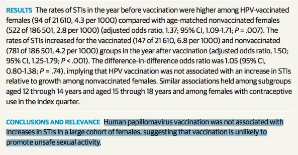 «Un estudio de cohortes concluye que la vacuna VPH no está asociada con un incremento de infecciones de transmisión sexual, sugiriendo que es improbable que la vacuna promueva actividad sexual insegura (3)».