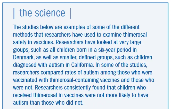 «Los estudios son ejemplos de algunos de los diferentes métodos que los investigadores han usado para examinar la seguridad del timerosal en las vacunas. Los investigadores han observado grupos muy grandes, por ejemplo todos los niños nacidos en un período de seis años en Dinamarca, como también grupos más pequeños y definidos, como los niños diagnosticados con autismo en California. En algunos de los estudios, los investigadores compararon las tasas de autismo entre los que se vacunaron con vacunas con timerosal versus los que no. Consistentemente, los investigadores encontraron que los niños que recibieron timerosal en las vacunas no tuvieron más probabilidades de tener autismo versus los que no recibieron timerosal (14)».