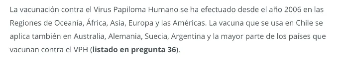 La misma vacuna que se usa en Chile se aplica también en Australia, Alemania, Suecia, Argentina y la mayor parte de los países que vacunan contra el VPH (5).