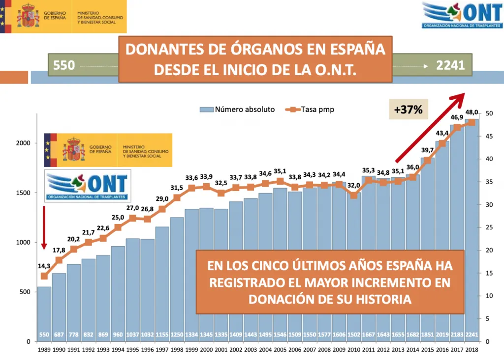 Gracias a la creación de la ONT, España logró pasar de 14 a 48 donantes por millón de población (pmp), logrando ascender al primer lugar en índices de trasplantes del mundo (5). Very cool, España \o/