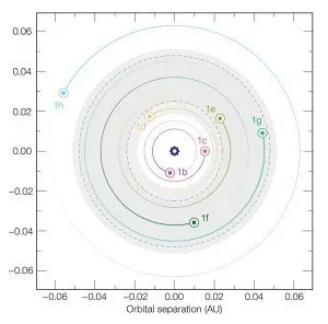 Para que nos hagamos una idea: esta estrella, que es levemente más grande que Júpiter, tiene a todos sus planetas (conocidos) en una órbita más cercana que la de Mercurio alrededor del Sol. Y no sólo eso: están tan cerca unos de otros, que parados en uno de ellos, podríamos ver incluso los accidentes geográficos del siguiente (que es, por ejemplo, lo que podemos hacer cuando observamos la Luna en el cielo).