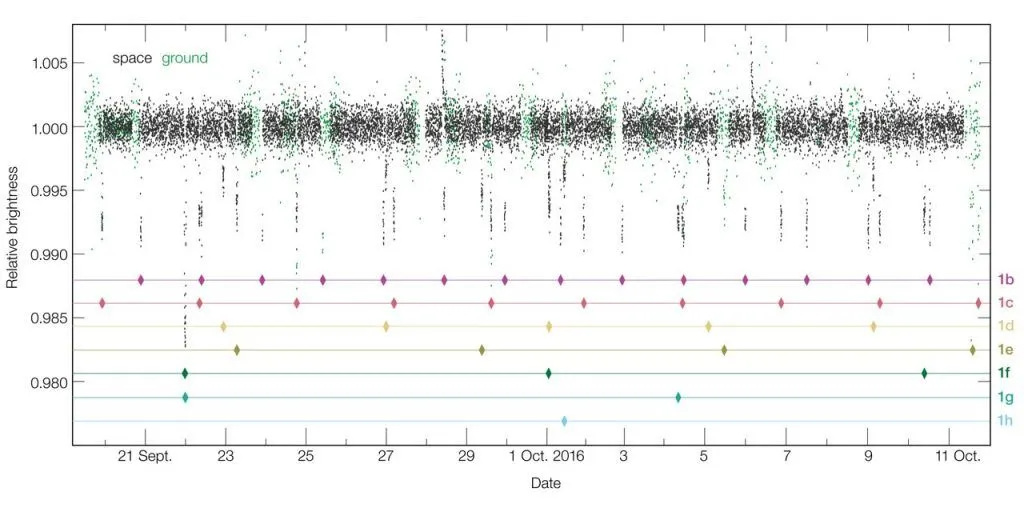 Spitzer no sólo confirmó la existencia de los 3 planetas identificados desde el cerro La Silla, sino que además captó curvas de brillo para 4 planetas adicionales: Trappist-1e, Trappist-1f, Trappist-1g y Trappist-1h (con periodos orbitales de 6,0, 9,2, 12,3 y 20 días respectivamente).